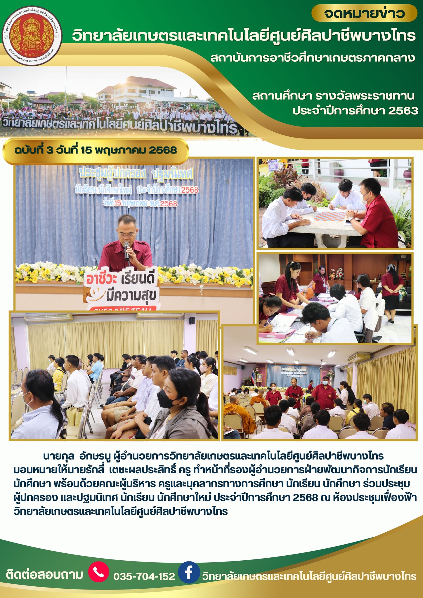 นายกุล อักษรนู ผู้อำนวยการวิทยาลัยเกษตรและเทคโนโลยีศูนย์ศิลปาชีพบางไทร มอบหมายให้นายรักสี่ เตชะผลประสิทธิ์ ครู ทำหน้าที่รองผู้อำนวยการฝ่ายพัฒนากิจการนักเรียน นักศึกษา พร้อมด้วยคณะผู้บริหาร ครูและบุคลากรทางการศึกษา นักเรียน นักศึกษา ร่วมประชุมผู้ปกครอง และปฐมนิเทศ นักเรียน นักศึกษาใหม่ ประจำปีการศึกษา 2568 ณ ห้องประชุมเฟื่องฟ้า วิทยาลัยเกษตรและเทคโนโลยีศูนย์ศิลปาชีพบางไทร