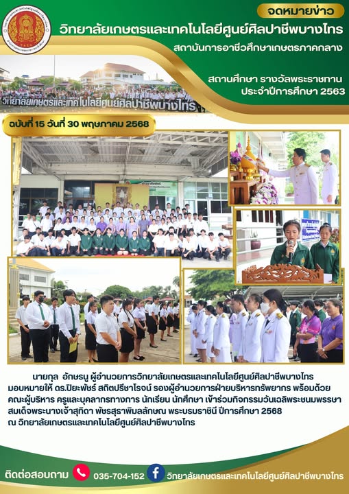 นายกุล อักษรนู ผู้อำนวยการวิทยาลัยเกษตรและเทคโนโลยีศูนย์ศิลปาชีพบางไทร มอบหมายให้ ดร.ปิยะพัชร์ สถิตปรีชาโรจน์ รองผู้อำนวยการฝ่ายบริหารทรัพยากร พร้อมด้วยคณะผู้บริหาร ครูและบุคลากรทางการ นักเรียน นักศึกษา เข้าร่วมกิจกรรมวันเฉลิพระชนมพรรษาสมเด็จพระนางเจ้าสุทิดา พัชรสุธาพิมลลักษณ พระบรมราชินี ปีการศึกษา 2568 ณ วิทยาลัยเกษตรและเทคโนโลยีศูนย์ศิลปาชีพบางไทร
