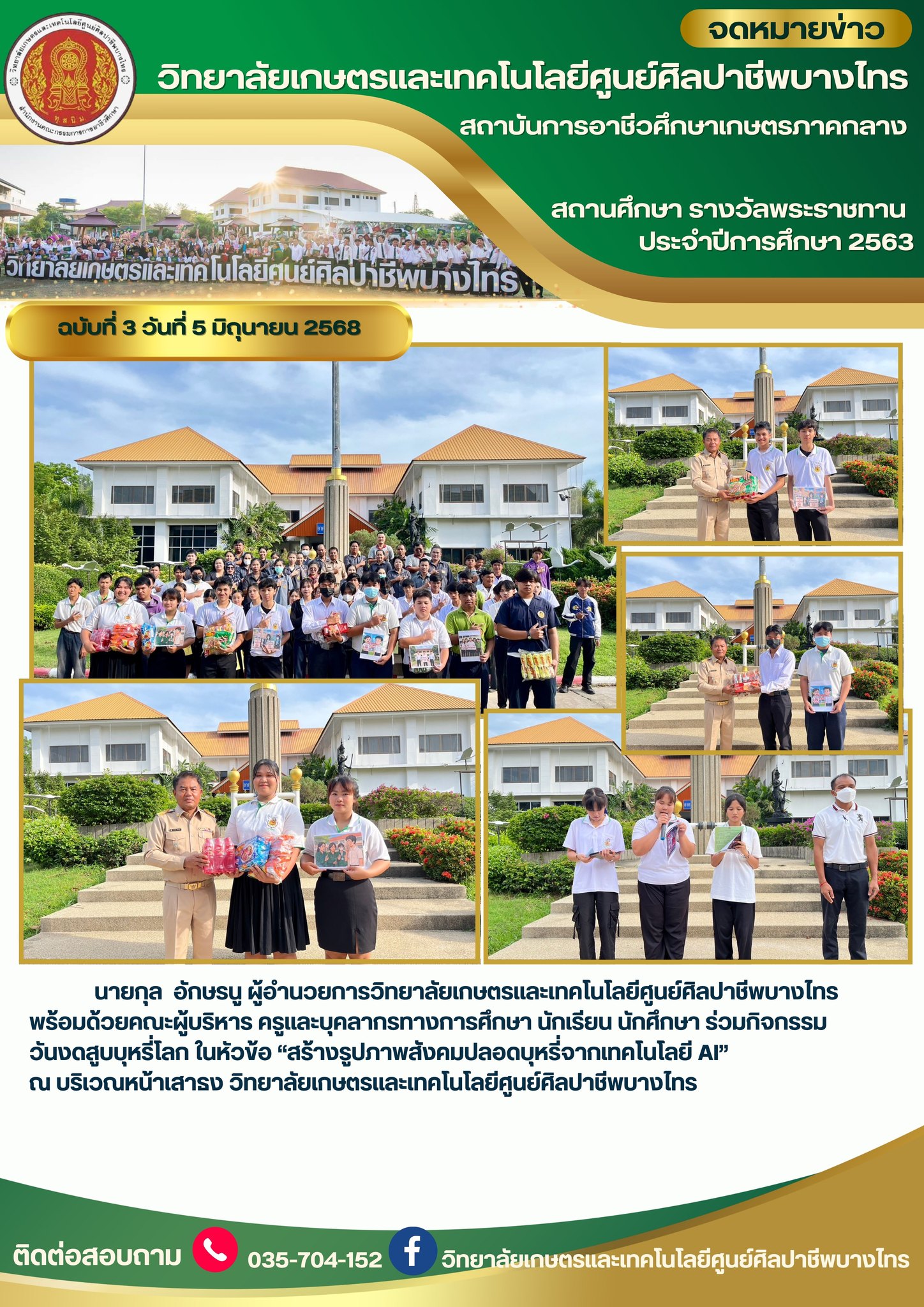 นายกุล อักษรนู ผู้อำนวยการวิทยาลัยเกษตรและเทคโนโลยีศูนย์ศิลปาชีพบางไทร พร้อมด้วยคณะผู้บริหาร ครูและบุคลากรทางการศึกษา นักเรียน นักศึกษา ร่วมกิจกรรม วันงดสูบบุหรี่โลก ในหัวข้อ “สร้างรูปภาพสังคมปลอดบุหรี่จากเทคโนโลยี AI” ณ บริเวณหน้าเสาธง วิทยาลัยเกษตรและเทคโนโลยีศูนย์ศิลปาชีพบางไทร